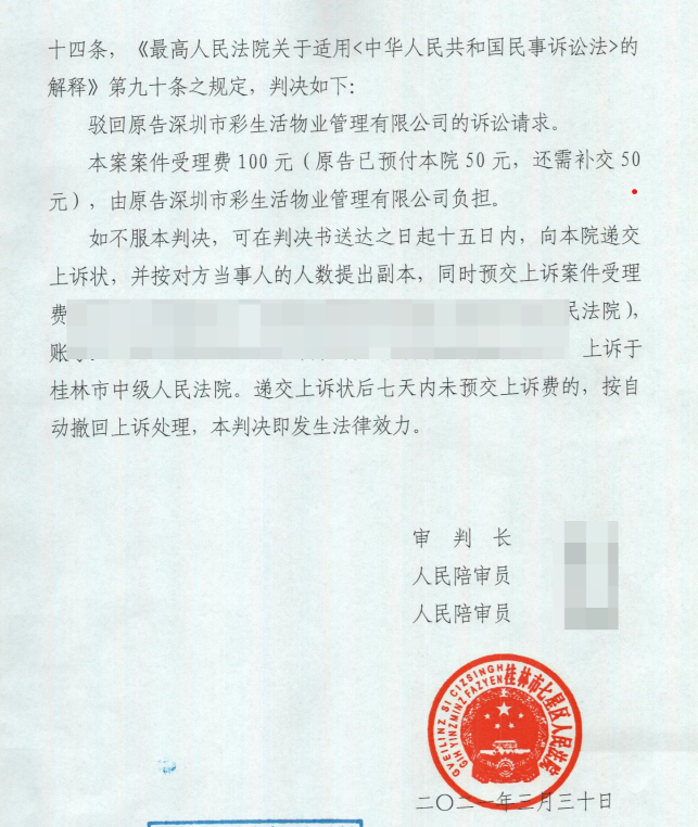 ▲2021年3月,七星区法院作出一审判决,驳回了彩生活公司的起诉 2021年7月,桂林中院驳回彩生活公司上诉,维持原判。