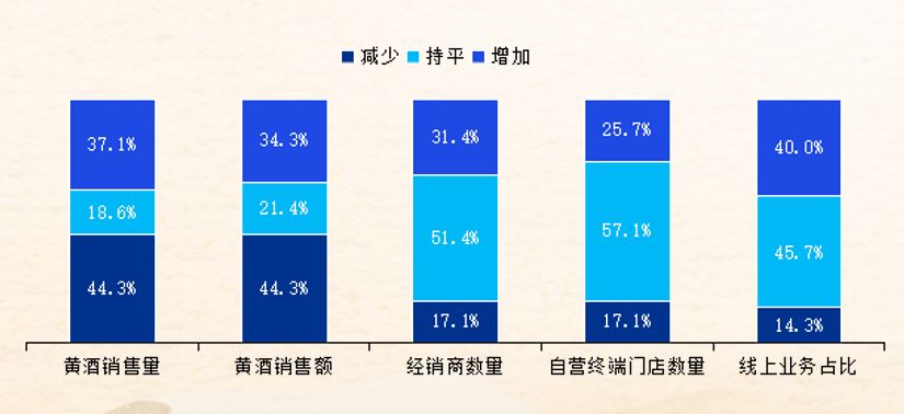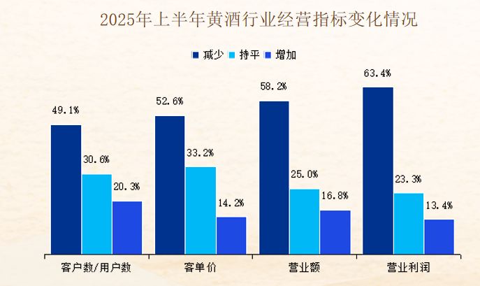 据中国酒业协会《2025年中国黄酒产业发展现状调研问卷》,今年上半年,58.2%、63.4%的调研企业表示黄酒营业额、营业利润有所减少;37.1%、34.3%的酒企表示黄酒销售量、销售额有所增加;同时,有20.3%的调研企业表示客户数量有所增加;客单价方面同比有所减少的企业比例达到 52.6%。