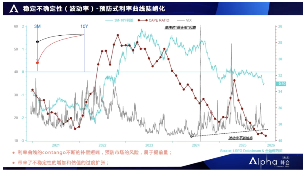 从利率曲线结构,也能看到美联储的“预防性操作”:英伟达闪崩后,美国国债“三个月减十年期”利差迅速倒挂,每一次倒挂都对应波动率的下降。这背后是美联储通过短端流动性调节,避免系统性风险扩散,为AI应用落地争取时间。