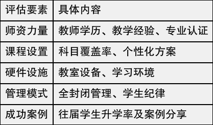此外,硬件设施和管理模式也不可忽视。一些机构采用全封闭式管理,有利于学生集中精力学习。最后,可以通过查看过往学员的成功案例来判断机构的实际效果。以下是一些评估参考要素: