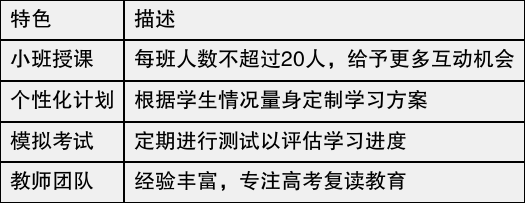 课程内容包括高考复读、高三应届冲刺、艺术生文化课以及春季和高职高考文化培训。学校注重小班教学,以便老师能够给予每个学生更多关注和指导。同时,施行全封闭式管理,让学子在一个相对无干扰的环境中专心学习。在这里,学生不仅能掌握正确的复习方法,还能学到实用的备考技巧,从而在新的一年勇攀高峰。