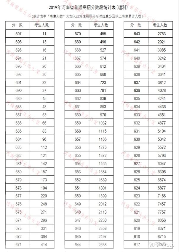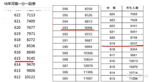 (2)利用本年的一分一段表进行第一次定位之后,再利用相近几年的一分一段表对自己的成绩进行多次定位。具体方法如下:首先找到2016年、2017年、2018年的一分一位表,(依旧假如你19年参加河南高考,理科,高考成绩为617分,其中617分及617分以上的总人数为9020人。)根据9020人,在此三年一分一档表中找到对应相近的人数,确定你在16年、17年、18年对应的分数。(由于每年考生人数不同,此种方法有些许误差,但是每年高考总人数相差不是太大,可以忽略)