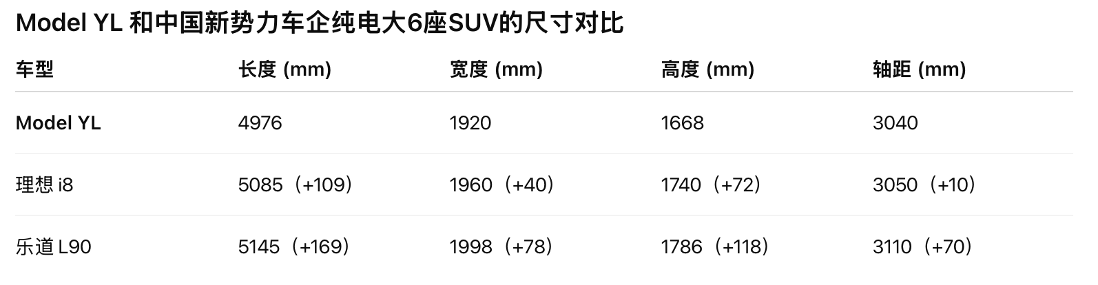 所以,Model YL最显著的变化就是车身尺寸。不过,横向对比理想i8、乐道L90(配置|询价)等中国新势力车企推出的纯电大6座SUV,Model YL在尺寸上并不占优势。