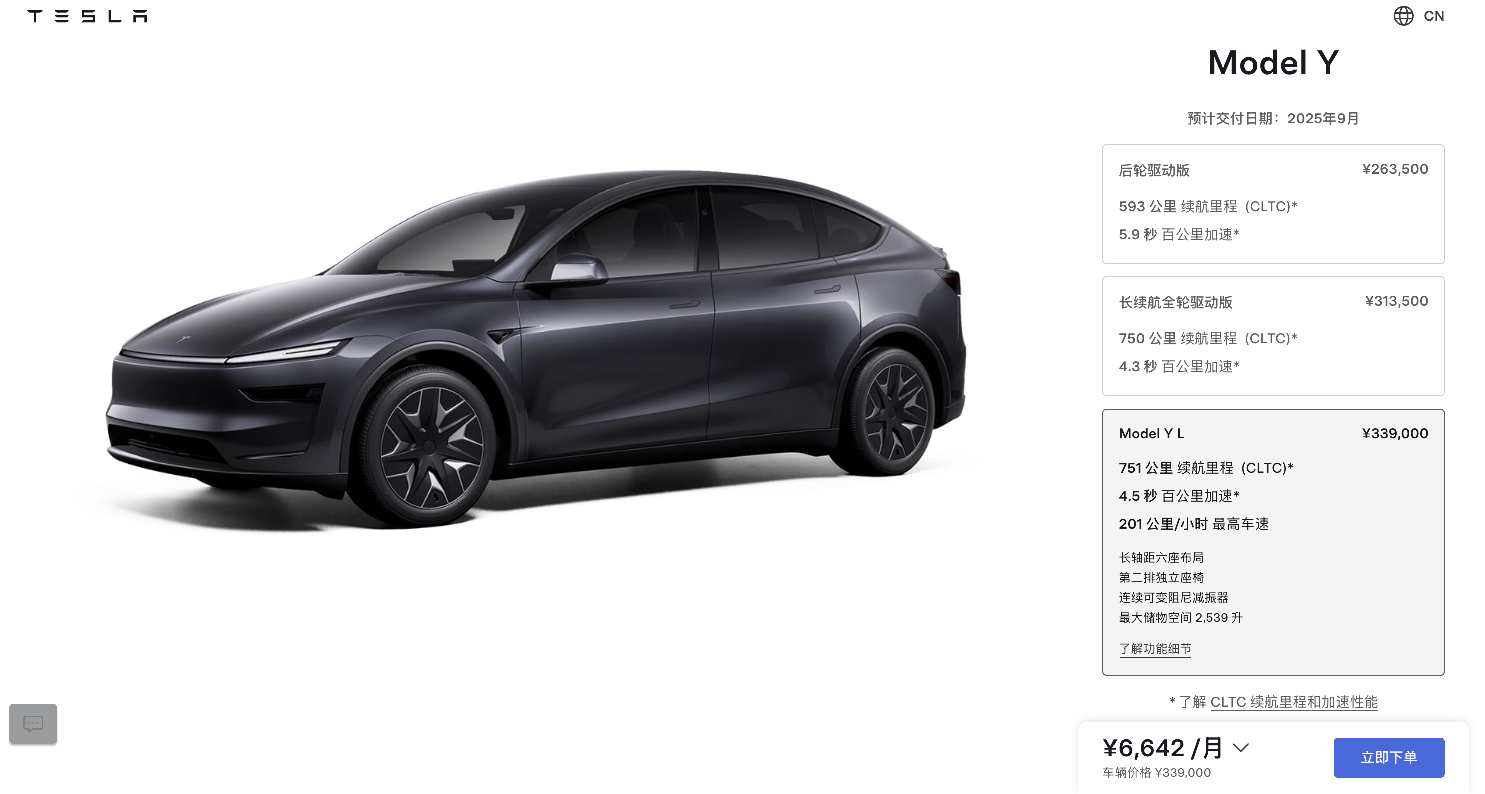 6座的布局,重新设计的车身,加长179mm、增高44mm、轴距增加150mm——8月19日,特斯拉Model YL(配置|询价)悄无声息地在官网上线,售价33.9万元。