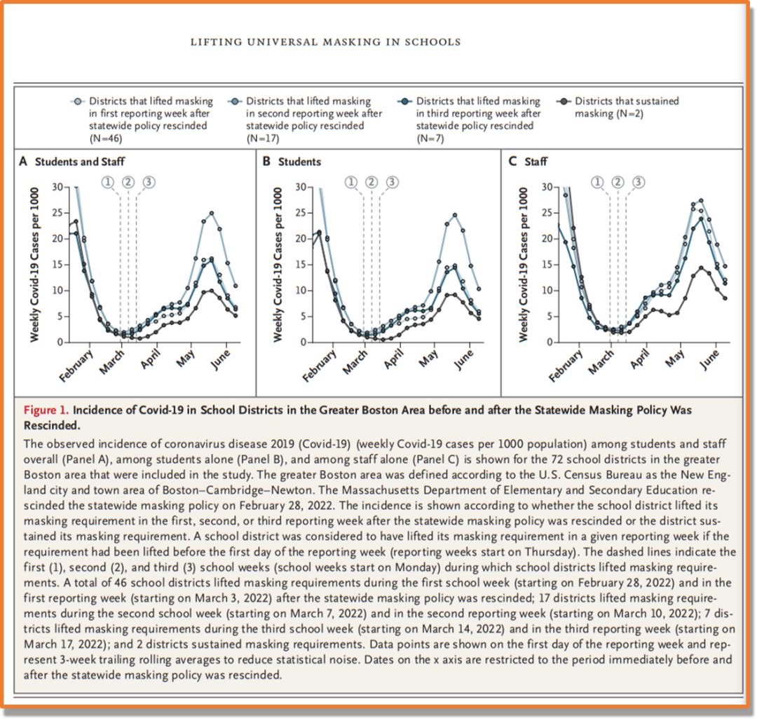 于是研究人员抓住机会,把大波士顿地区已经取消口罩令的学校,以及还没有取消的学校,抓到一起做了个对比。