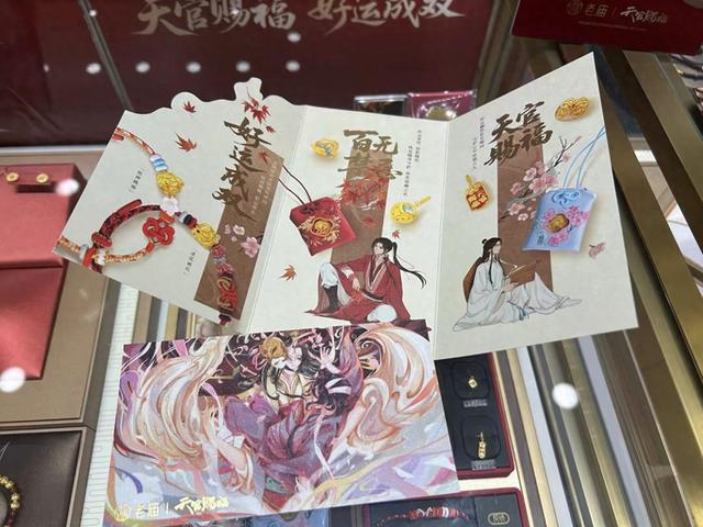 为了吸引年轻人,老庙黄金《天官赐福》联名款还推出了限量明信片和充满二次元感的宣传册。
