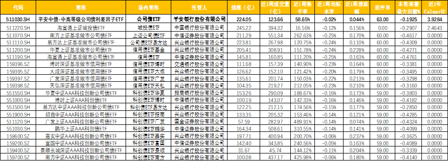 本周继续关注本轮债市调整以来平安公司债ETF(511030)回撤控制排名第一,上周场内成交贴水最少,净值相对稳健且回撤可控,可参考下表(本轮债市调整自2025年8月8日起算):