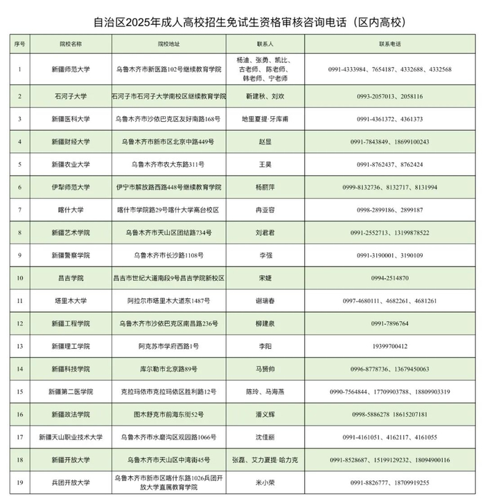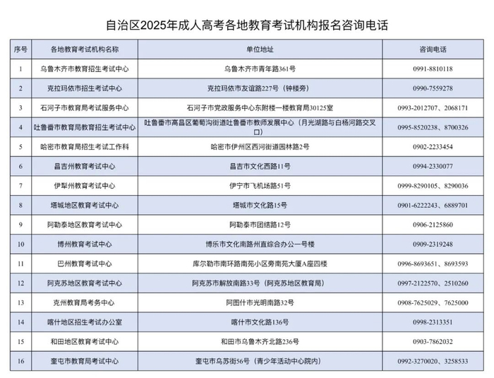 考生可登录新疆教育考试院官方网站查看《关于做好新疆维吾尔自治区2025年成人高校考试招生工作的通知》详细内容。《新疆维吾尔自治区2025年成人高校招生照顾加分登记表》《新疆维吾尔自治区2025年成人高校招生免试入学申请表》考生在新疆教育考试院官方网站下载。