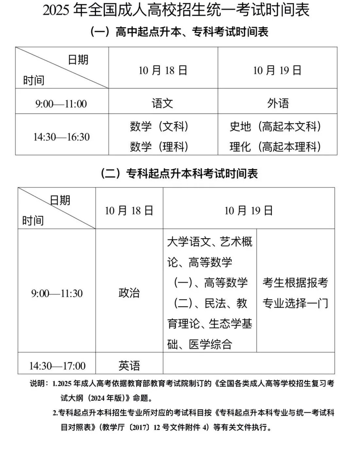 据教育部统一安排,2025年成人高校招生全国统一考试(简称成人高考)将于2025年10月18日至19日举行。招生类型分高中起点升本科(以下简称高起本)、高中起点升专科(以下简称高起专)和专科起点升本科(以下简称专升本)三种。在校学习形式分脱产、非脱产两种,脱产最短学习时间为:高起本四年、高起专和专升本两年,非脱产最短学习时间为:高起本五年、高起专和专升本两年半。