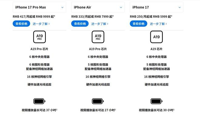 (图片来源:苹果官方)价格方面,iPhone Air各版本的售价如下: