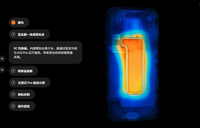 (图片来源:苹果官方)不过有意思的是,iPhone 17 Pro系列首次加入了VC均热板设计,能够进一步释放出A19 Pro处理器的性能,再加上全新的铝合金中框,是目前散热最强的iPhone。